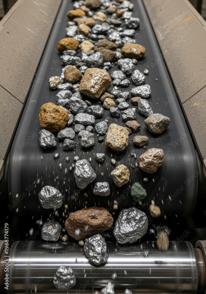 A conveyor belt transports various rocks and minerals, including shiny metallic ores and rough stones. The scene highlights industrial mining processes. #1968774179