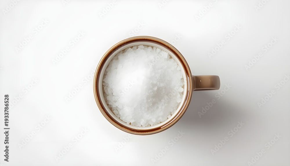 A copper mug filled with white sugar on a plain white background #1933786528