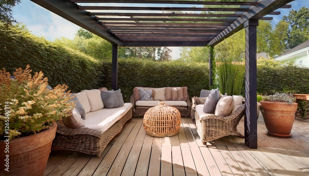 a cozy backyard patio with wicker furniture potted plants and a shaded pergola perfect for summer relaxation #1265300714