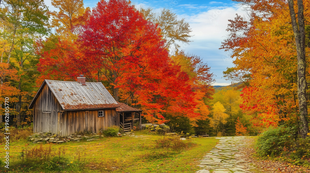 A cozy cabin surrounded by stunning red and orange trees, capturing the essence of autumns beauty and tranquility #1962805770