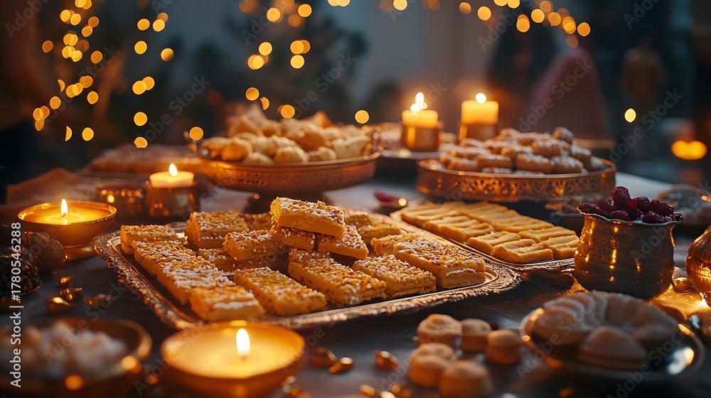 A cozy Diwali scene of a dining table filled with sweets, mithai boxes open, sweets spilling onto silk cloth, candlelight bouncing off the shiny wrappers and golden trays. #1780546288