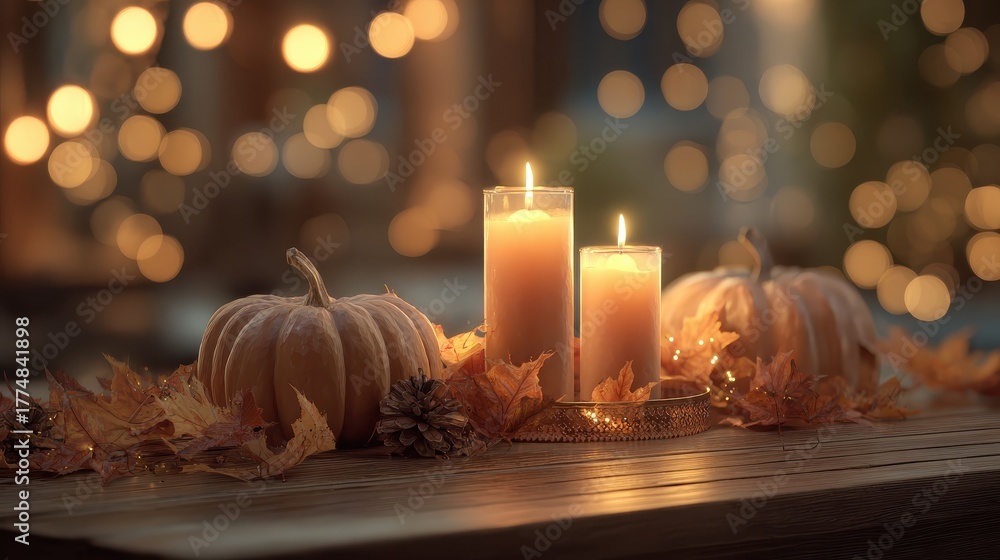 a cozy halloween scene with lit candles pumpkins and autumn leaves on a wooden table soft bokeh lights create a warm atmosphere #1774841898