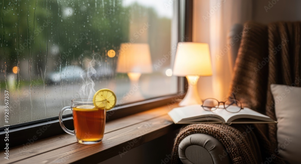 A cozy indoor scene with a steaming cup of tea on a rainy day, evoking a sense of comfort and relaxation. #1928967357