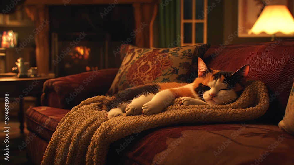 A cozy scene featuring a calico cat peacefully sleeping on a richly textured blanket on a warm, inviting sofa, with soft, ambient lighting and a hint of a fireplace in the background #1374831306