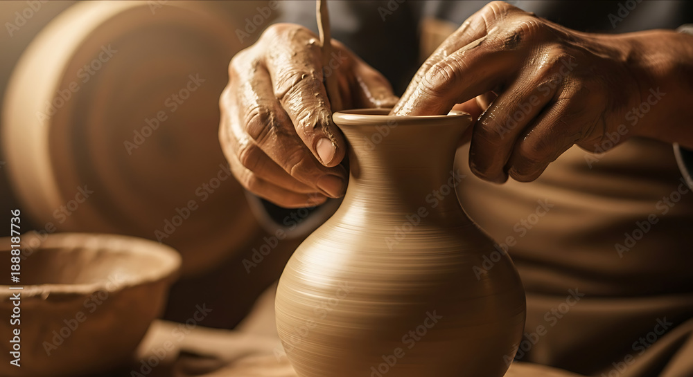 A craftsman's hands delicately shape wet clay into a vase on a pottery wheel. #1888187736