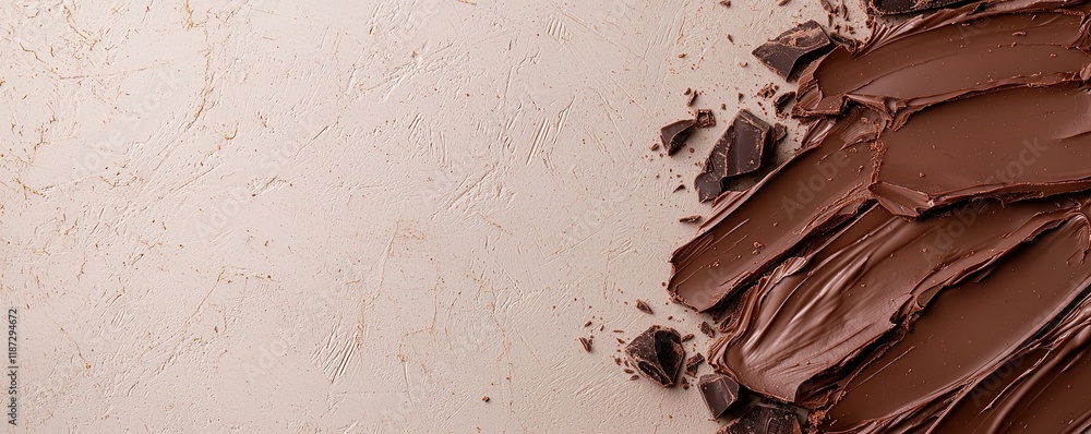 A creamy backdrop features rich chocolate spread, artistically smeared, evoking indulgence and culinary delight. #1187294672