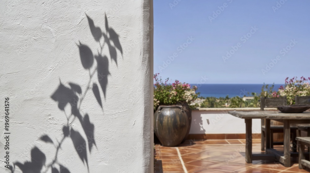 A crisp, dark grey plant shadow cast against a sharp, bright white stucco wall in a sun-drenched Mediterranean patio with terracotta tiles, bougainvillea, and a blue ocean view. #1969641576