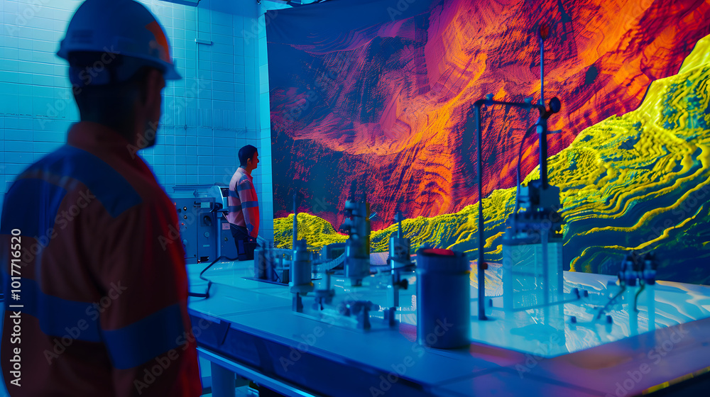 A cross-sectional view of an offshore drilling rig extending down to the ocean floor, showing the intricate pipelines, wellbore, and underwater robotics handling the drilling process #1017716520