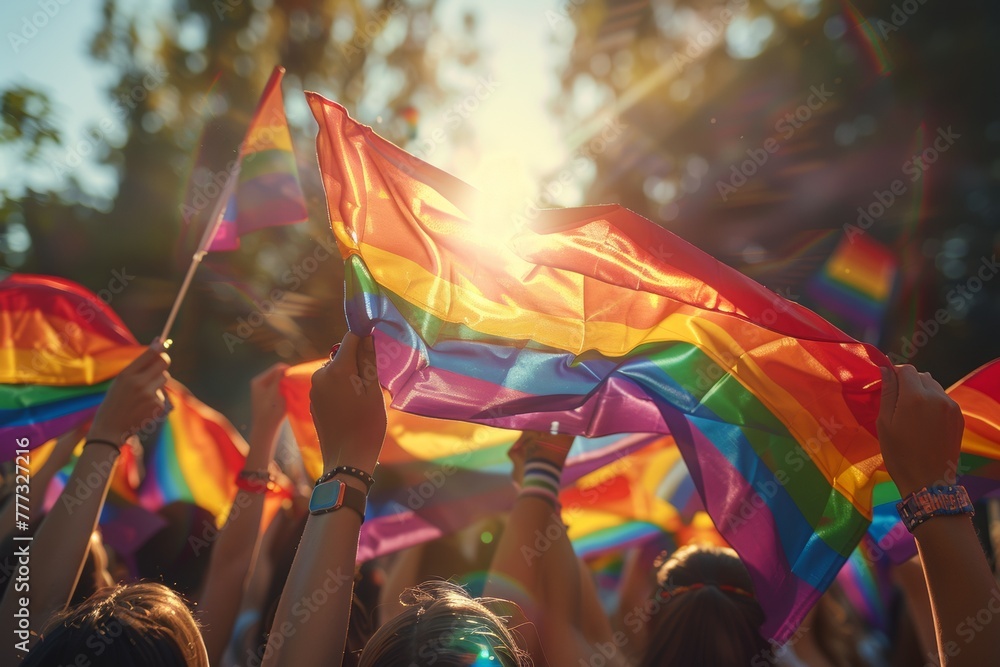 A crowd at a pride event waves rainbow flags with a warm sunset in the background, Vibrant pride parade celebration #777327216