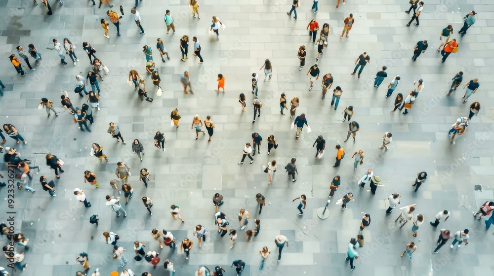A crowd of people scatter across a vast, open plaza, each individual moving with their own purpose under an expansive, clear sky. #923326211