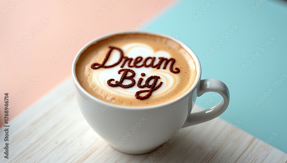 A cup of cappuccino with foam art spelling “Dream Big” in chocolate powder on a soft pastel background, symbolizing motivation and positivity. #1768946714
