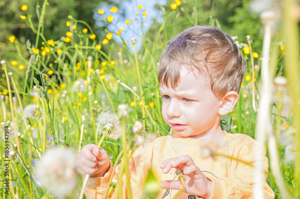 A curious little boy bends down to explore vibrant wildflowers along a path, capturing the innocence of childhood and connection to nature's beauty and diversity #1836947914