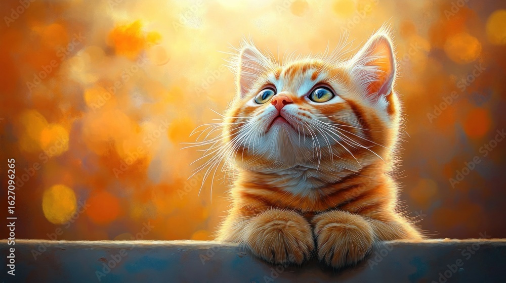 A curious orange tabby kitten with bright eyes gazing upward against a warm, softly blurred autumnal background with glowing orange bokeh lights #1627096265