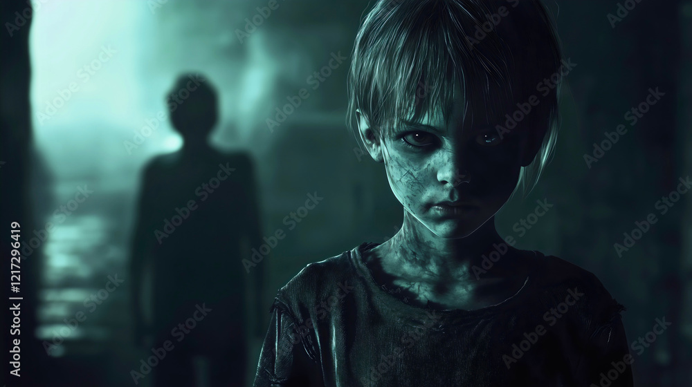 A cursed, possessed demonic child wandering through various haunted villages, the eerie child surrounded by a ghostly fog, with its terrifying demon lurking behind. #1217296419