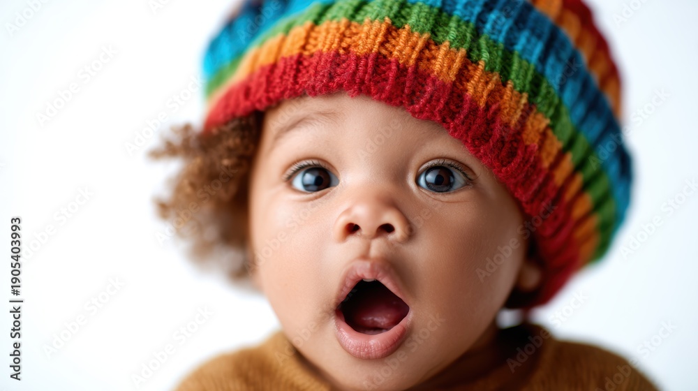 A cute baby with big expressive eyes and an open mouth, wearing a vibrant rainbow-striped knit hat, showcasing a moment of surprise or excitement in a soft light setting. #1905403993