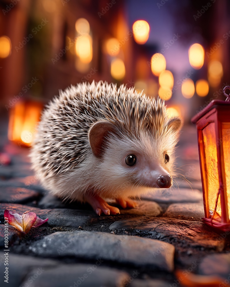 A cute hedgehog walking on a cobblestone street with warm lantern light at night #1800301637