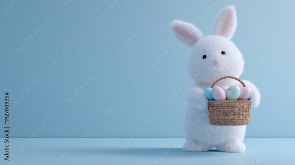 A cute white bunny holds a small basket filled with colorful Easter eggs. The background is a soft blue, creating a cheerful spring atmosphere. #1927689354