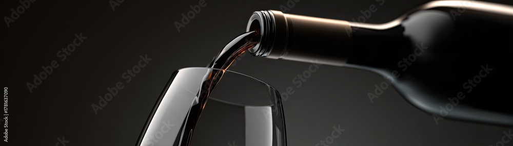 A dark, elegant scene featuring a bottle pouring red wine into a glass, showcasing the rich color and smooth flow. #1781637090