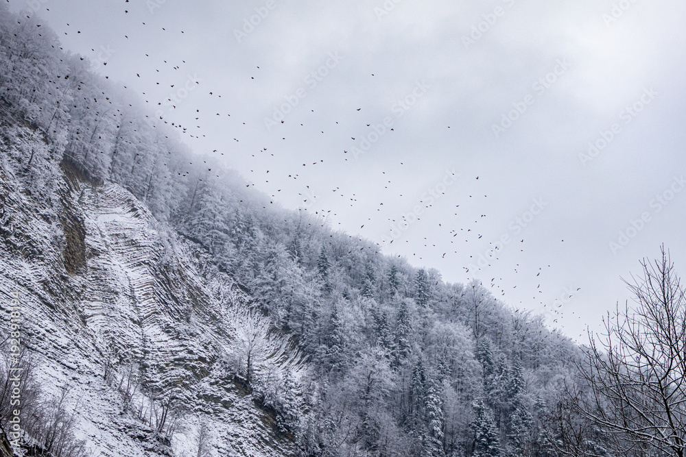 A dark flock wheels above a frosted mountain forest as ridges fade into mist and the pale sky presses low capturing the stark poetry of winter on a quiet rugged hillside #1928918194