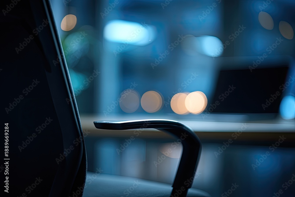 A dark office chair armrest with blurred city lights at dusk outside #1889669284