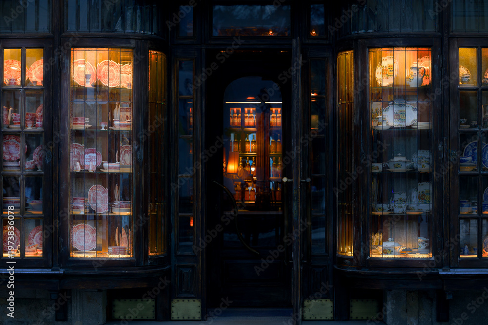 A dark storefront with lit display cases filled with colorful plates and cups at night #1973836078