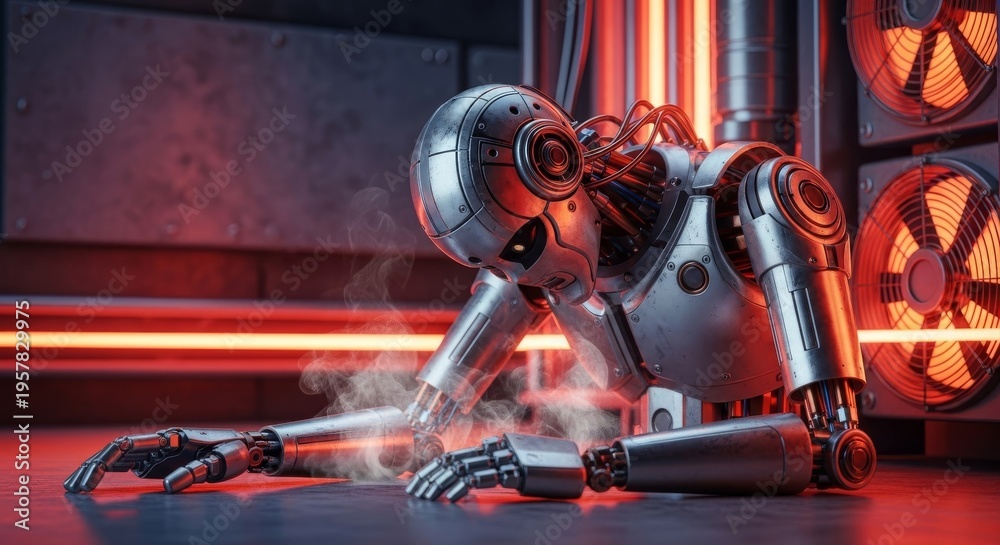 A deactivated metallic robot sits slumped in a dark industrial facility, surrounded by faint smoke and cooling mechanical components, machine, damaged, tech #1957829975