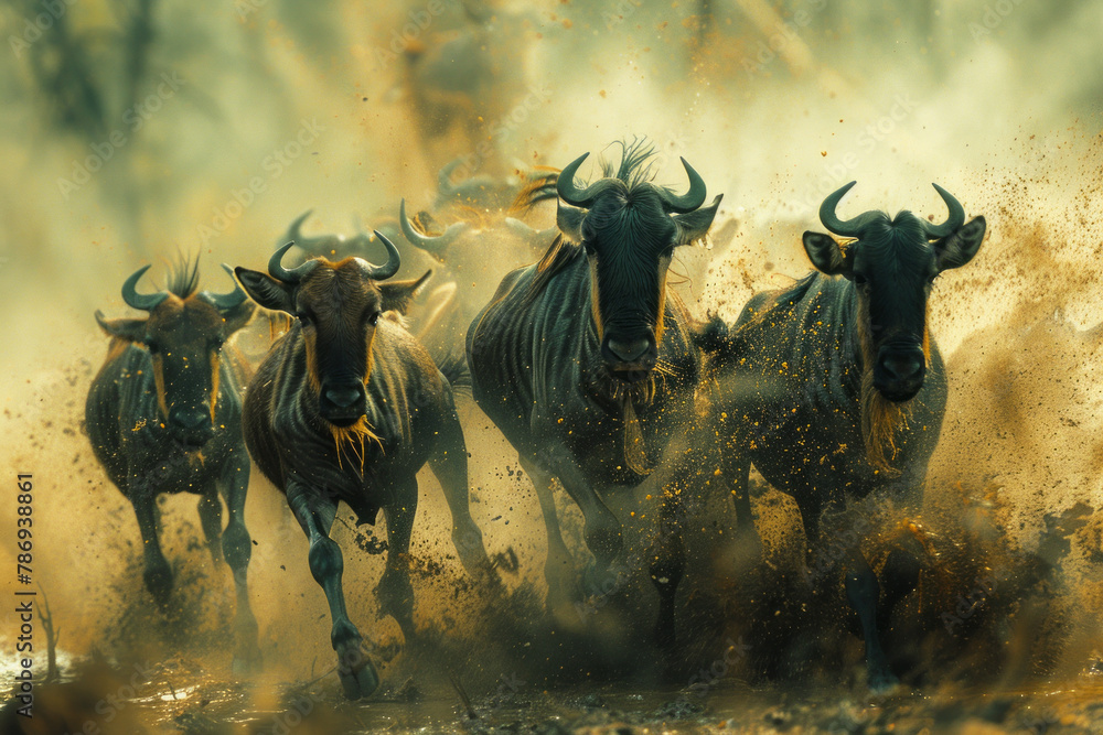 A depiction of newborn wildebeests taking their first steps, the next generation embarking on their #786938861