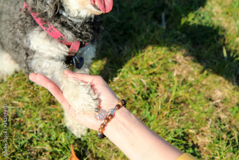 A detail picture of holding hand and dog´s paw. It is a symbol of partnership and trust between the owner and his pet. #342494177