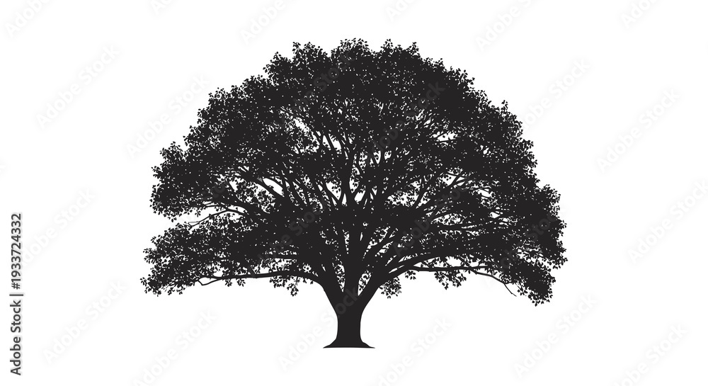 A detailed black silhouette of a large mature tree with expansive foliage creating a striking silhouette high quality #1933724332