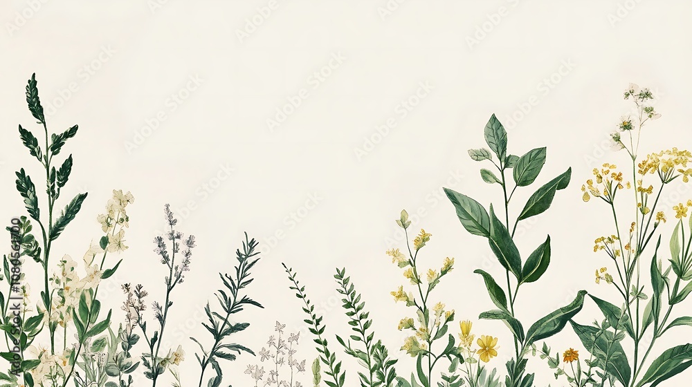A detailed botanical wallpaper showcasing hand-drawn illustrations of different plant species with labeled parts on a light background #1080561700
