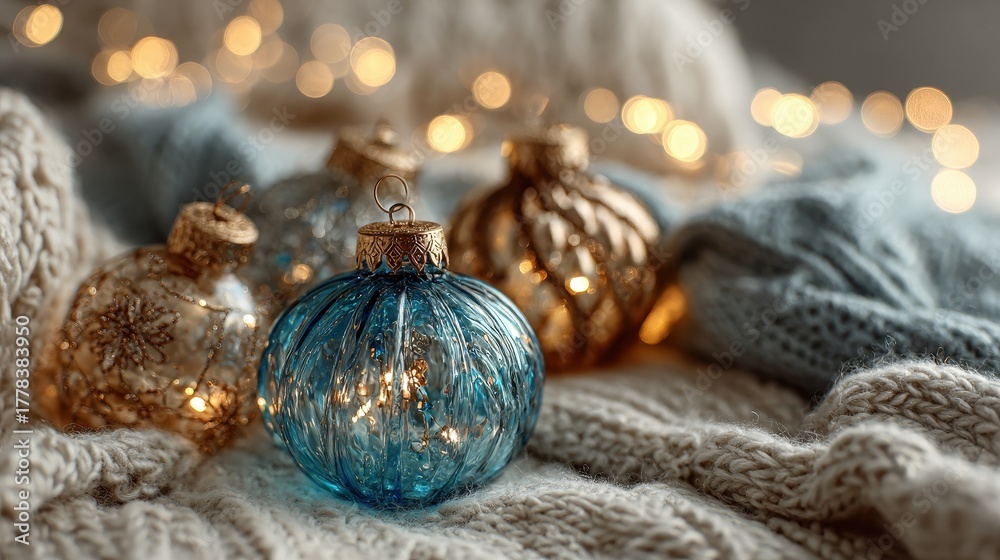 A detailed photo of shiny Christmas ornaments resting on soft fabric near twinkling lights capturing the essence of handcrafted holiday decor #1778383950
