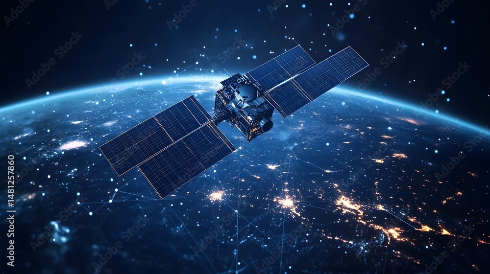 A detailed satellite orbits Earth, its solar panels gleaming as it powers a global network of communication. City lights illuminate the planet below. Abstract wireframe in dark blue. #1481257860