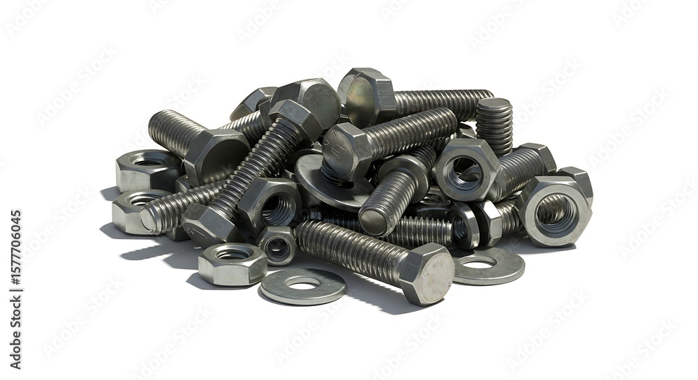 A detailed studio shot of a pile of assorted metal hardware, including various hex bolts, nuts, and washers, isolated on a clean white background #1577706045
