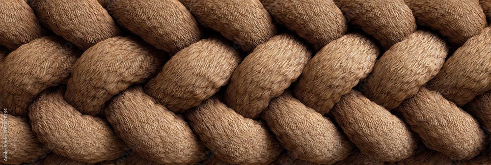 A detailed view of a thick braided rope featuring a warm brown color and fibrous texture. The interlocking strands create a rhythmic pattern with soft, diffuse lighting across the frame. #1971026234