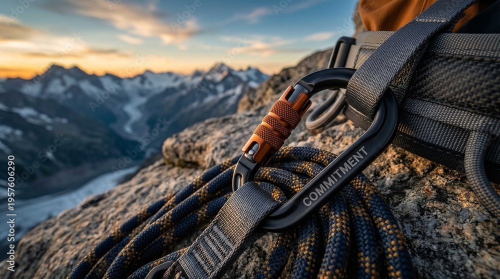 A detailed view of climbing equipment, including a carabiner with the word 'COMMITMENT' engraved, connected to orange webbing and a harness, set against a rocky mountain backdrop #1957606290