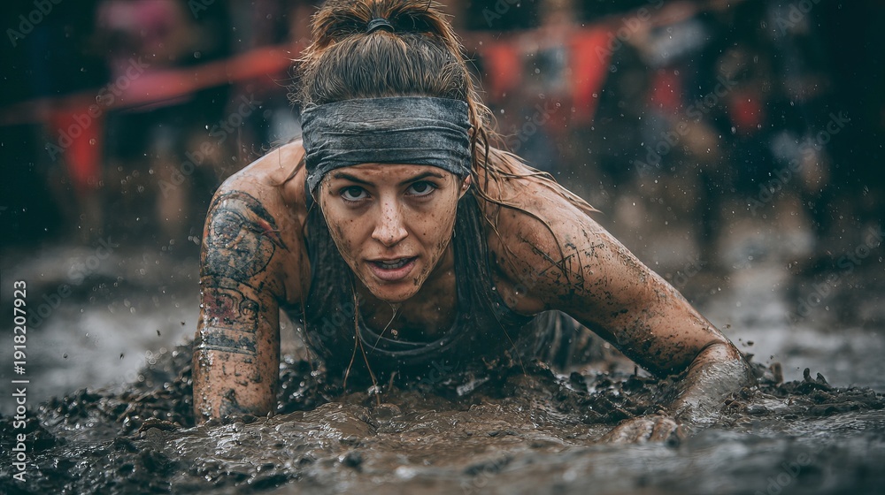 A determined woman crawling through mud at an obstacle course event with a focused expression #1918207923