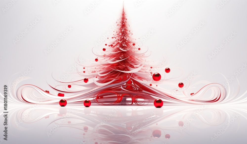A digital art illustration of a Christmas tree with red and white swirls adorned with red ornaments at the base on a plain white background. #1801169319