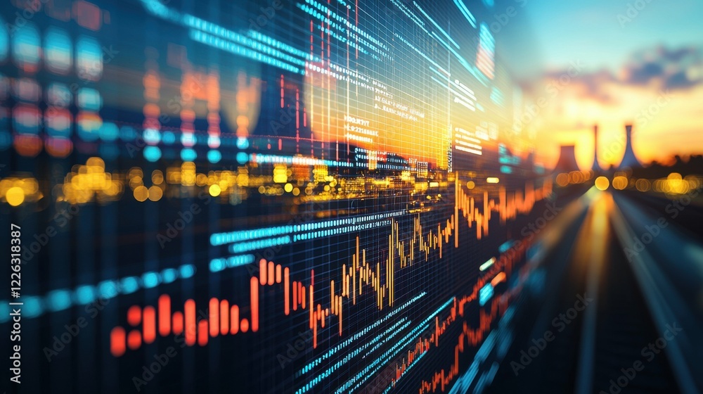 A digital graph showing rising energy stocks with a nuclear power plant image in the background, representing the growing influence of nuclear energy in the energy market and financial sectors #1226318387