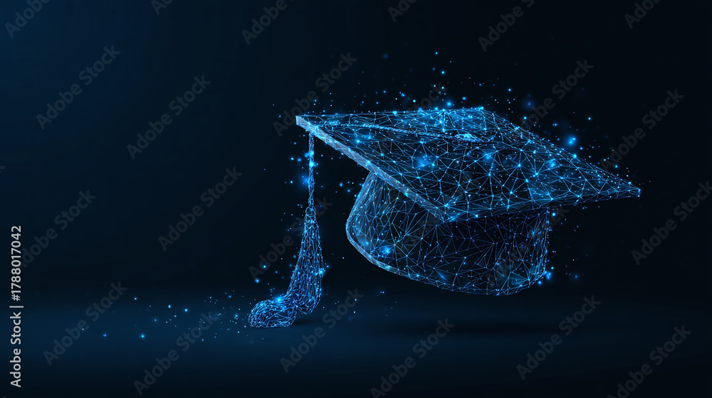 A digital rendering of an academic graduation cap composed of glowing blue particles, against a dark background, representing knowledge and learning #1788017042