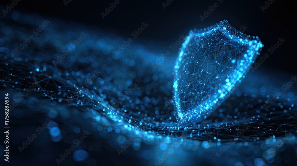 A digital shield made of glowing particles, symbolizing cybersecurity and protection in a futuristic, interconnected environment. #1758287694