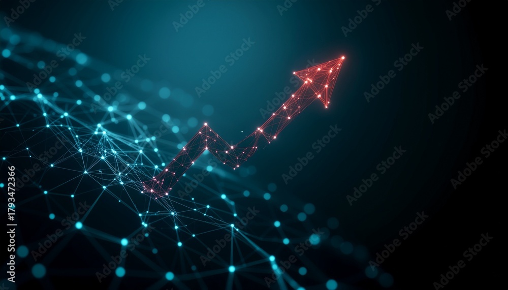 A digitally rendered image of a red arrow pointing upwards, representing growth, success, and progress. The arrow is surrounded by a network of interconnected dots and lines. #1793472366