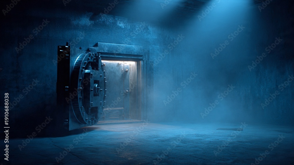 A dimly lit vault with an open door revealing a mysterious interior #1910688038