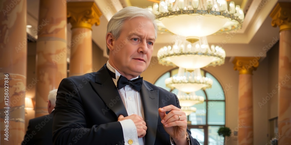 A distinguished older man in a dark suit stands indoors, appearing formal and poised with a subtle, warm, and professional ambiance conveyed through neutral tones and smooth textures. #1758027836