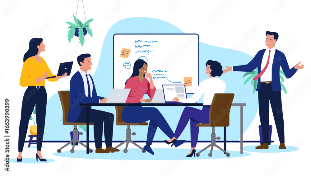 A diverse group of business people in an office meeting, with a presenter standing by a whiteboard and colleagues seated with laptops, flat design vector illustration #1653990399