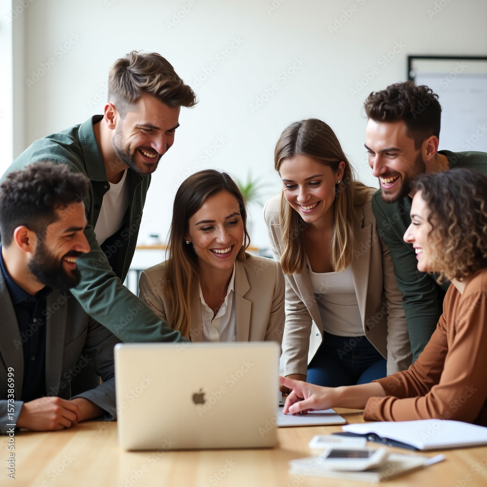 A diverse group of business professionals gathers around a laptop in a modern office, collaborating on a project and sharing ideas with enthusiasm and teamwork #1573386999