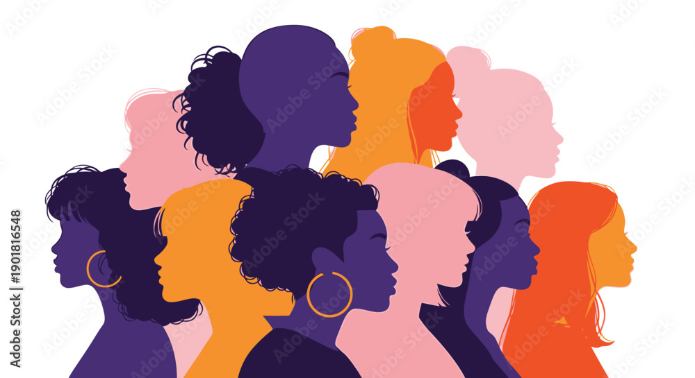 A diverse group of women of color are depicted in profile, showcasing a variety of hairstyles and skin tones in vibrant colors. #1901816548