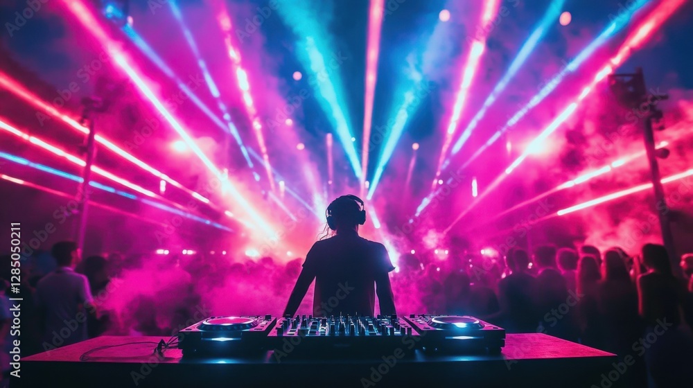 A DJ at a music festival, standing behind a turntable with vibrant neon lights, lasers, and a crowd dancing under the night sky. #1285050211