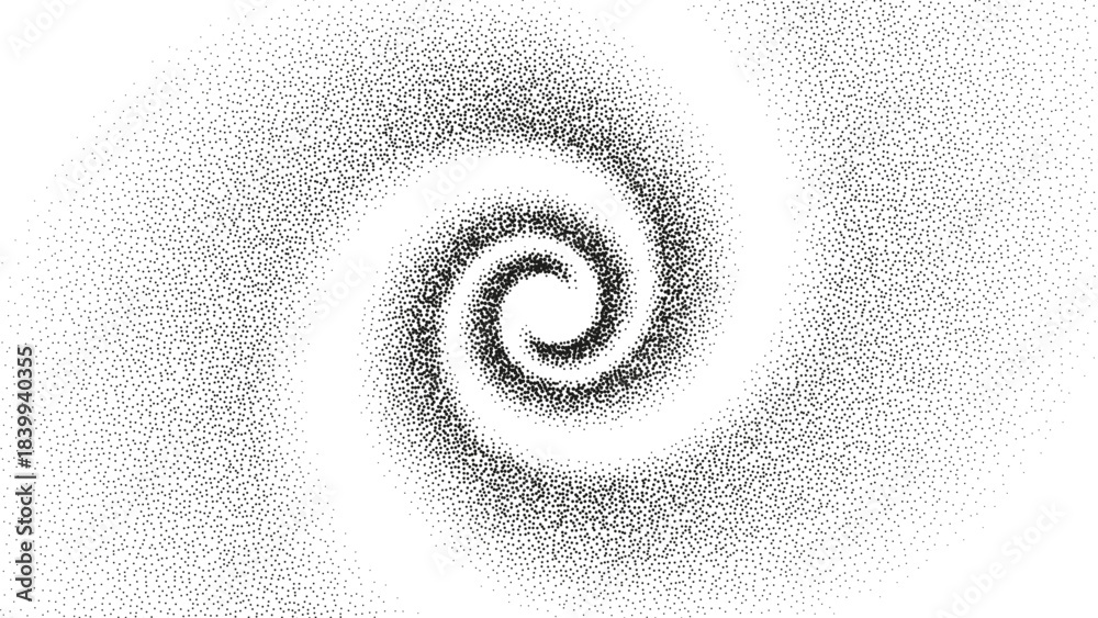 A dotted grainy gradient spiral flow. Vector gritty vortex with optical illusion. Tunnel with black stipple texture effect. Swirl of gritty pattern made by black dots or particles with stipple effect. #1839940355