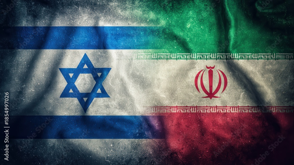 A dramatic depiction of the Israeli and Iranian flags, symbolizing complex geopolitical relations through bold colors and textures. #1854997026