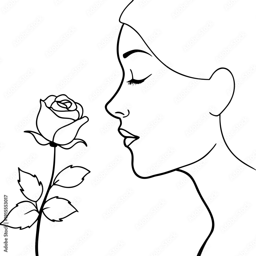 A dreamy girl enjoying the scent of a delicate rose, black and white sketch-style illustration, symbol of romance and beauty, Valentine's Day, International Women's Day #1915553017